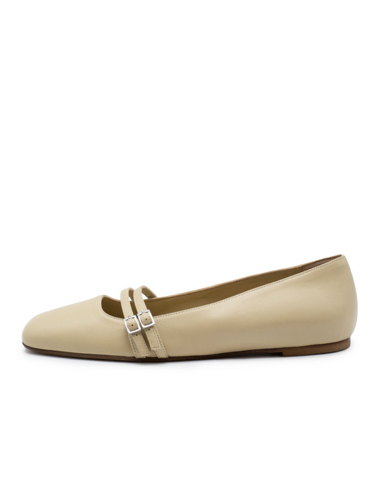 Beige Square Toe Ballet Flats With Double Buckled Strap