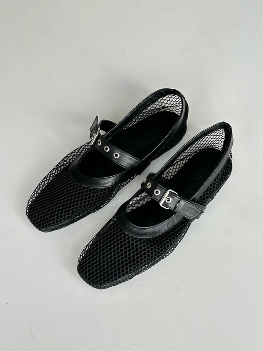 Black Fishnet Ballet Flats Mary Janes With Thin Buckle Strap