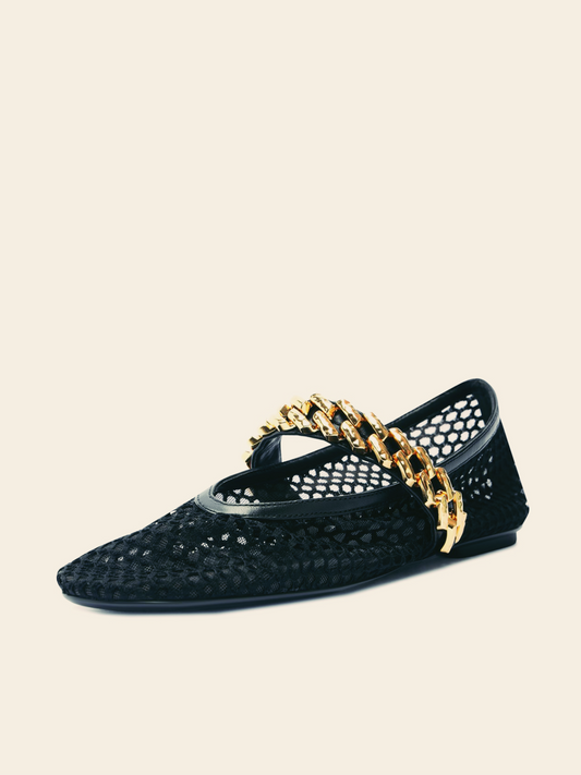 Black Fishnet Round Toe Flats Mary Janes With Gold Chain Strap