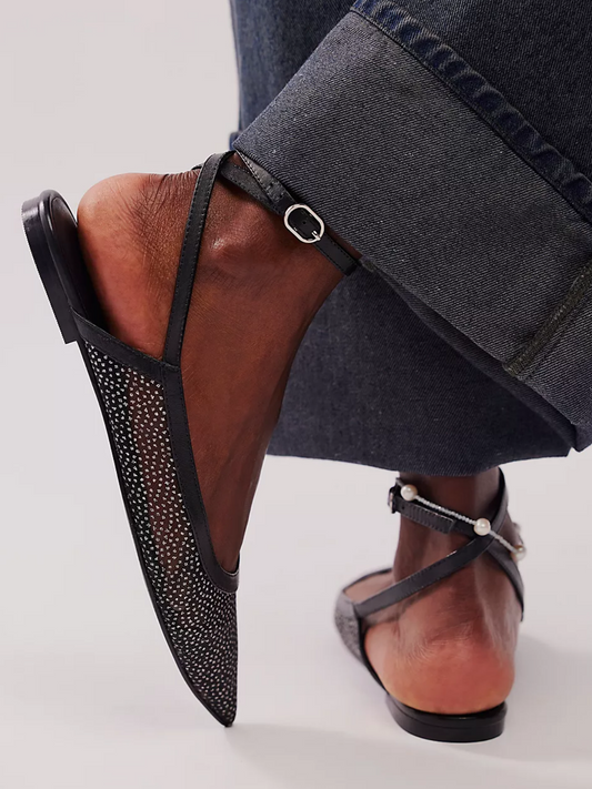 Black Glitter Mesh Pointy Toe Flats With Ankle Wrap Strap
