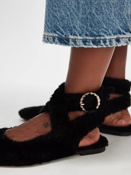Black Fluffy Pointed-Toe Slip-On Wrapped Ankle Strap Flats