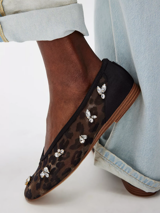 Black Leopard Mesh Square-Toe Rhinestone Ballet Flats