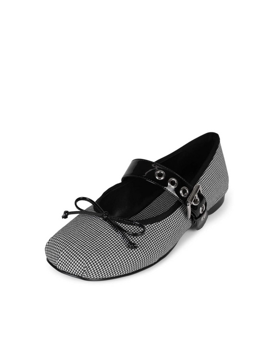 Black Houndstooth Fabric Square-Toe Bridge Strap Ballet Flats With Bow