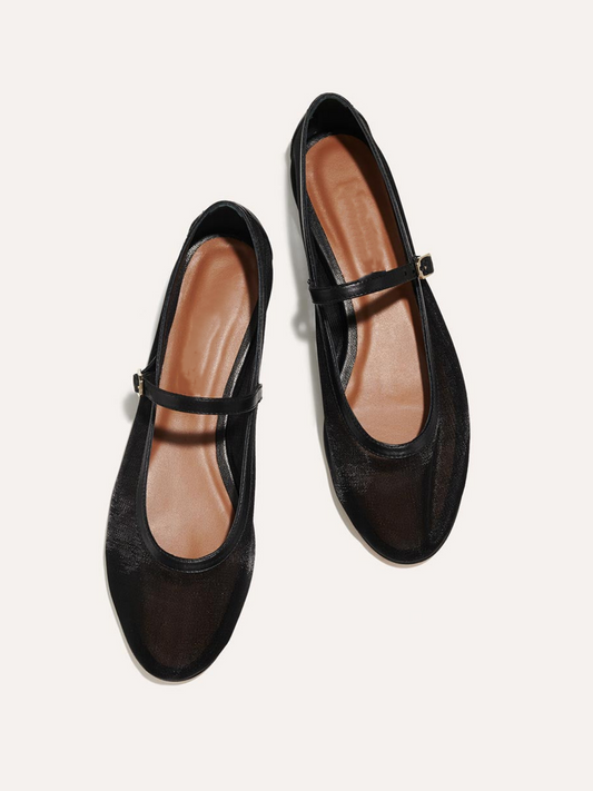 Black Mesh Round-Toe Ballerinas Flats Buckled Mary Janes