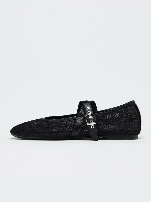 Black Mesh Round-Toe Bridge Buckle Strap Ballet Flats