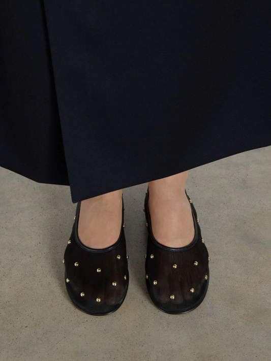 Black Mesh Round-Toe Ballet Flats With Gold Studs