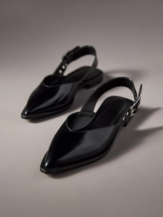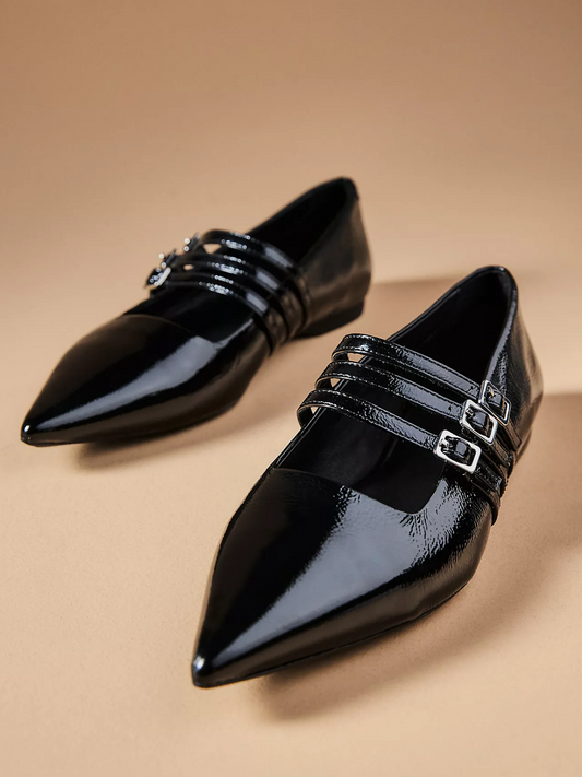 Black Pointed-Toe Buckled Ankle Strap Flats