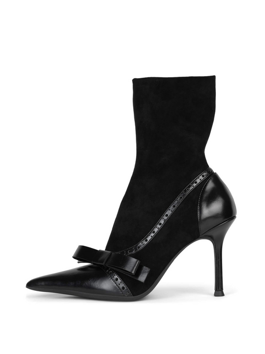 Black Pointed-Toe Half-Zip Mid Calf Stiletto Boots With Bows