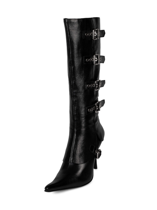 Black Pointed-Toe Full-Zip Mid Calf Stiletto Boots With Buckles