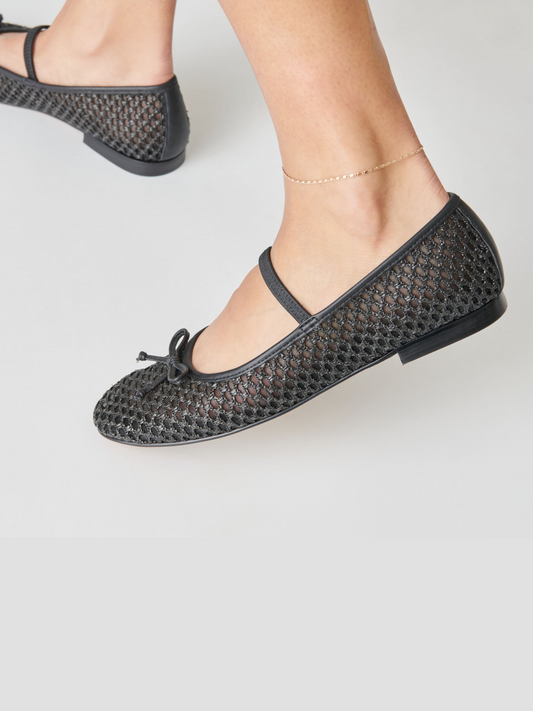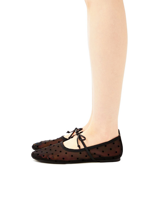 Black Polka Dot Mesh Square-Toe Ballet Flats Mary Janes With Bow Band
