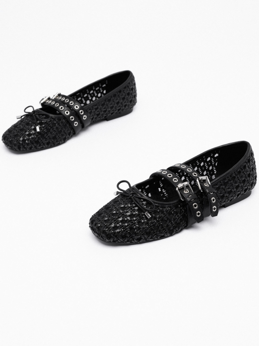 Black Raffia Woven Bow Ballet Flats Mary Janes With Grommet Buckled Straps