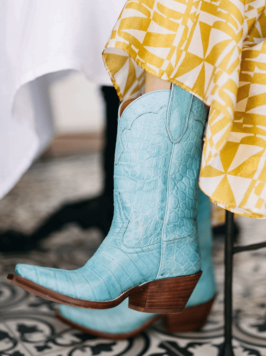 Snip-Toe Wide Mid Calf Cowgirl Boots - Blue Crocodile-Embossed Vegan Leather