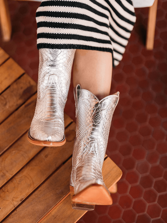 Snip-Toe Wide Mid Calf Cowgirl Boots - Metallic Silver Snakeskin Vegan Leather