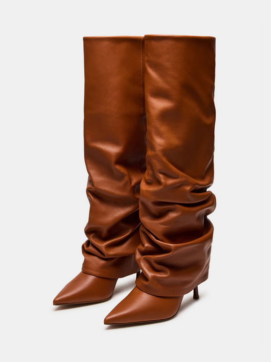 Tan Pointed-Toe Fold-Over Wide Mid Calf Stiletto Boots
