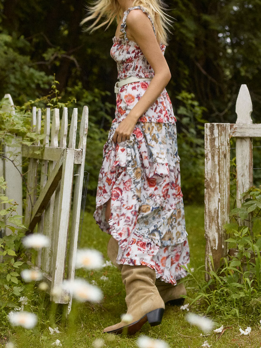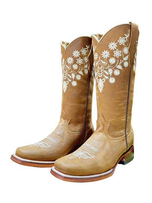 Tan Square-Toe Floral Embroidery Mid Calf Cowgirl Boots