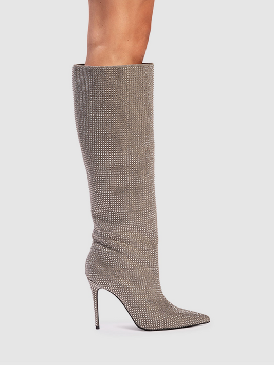 Taupe Faux Suede Pointed-Toe Crystal Slouchy Wide Mid Calf Stiletto Boots