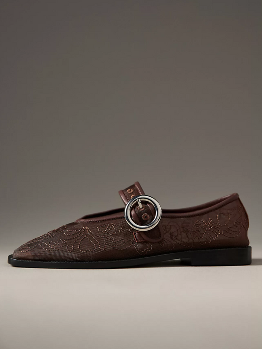 Brown Mesh Square-Toe Embroidery Bridge Strap Ballet Flats