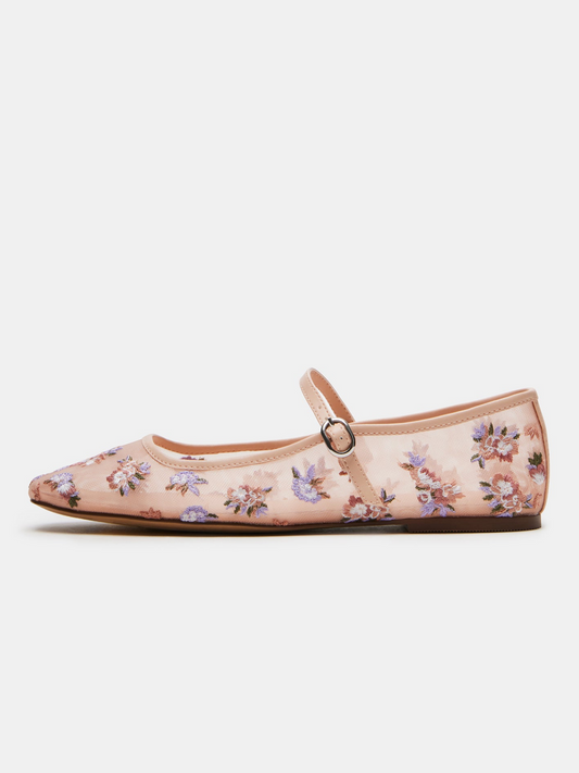 Pink Mesh Square-Toe Floral Embroidery Bridge Strap Ballet Flats