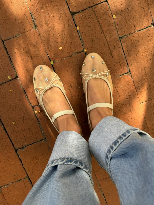 Nude Mesh Bow Round-Toe Mary-Jane Cute Ballet Flat With Sparkle Rhinestones