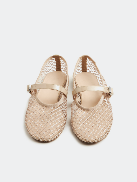 Fishnet Round-Toe Ballet Flats Mary Janes With Buckled Strap In Beige
