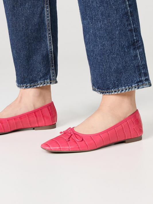 Cerise Pink Crocodile Embossed Bow Square Toe Ballet Flats