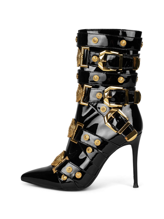 Patent Black Pointed-Toe Full-Zip Strappy Buckled Ankle Stiletto Boots With Gold Lion Emblems