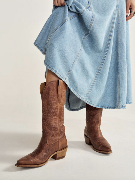 Distressed Brown Snip-Toe Stitch Wide Mid Calf Cowgirl Boots