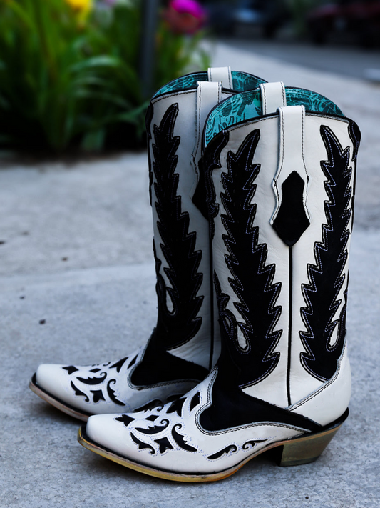 Contrast White And Black Snip-Toe Inlay Applique Wide Mid Calf Cowgirl Boots