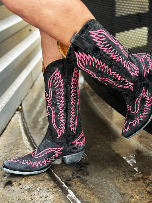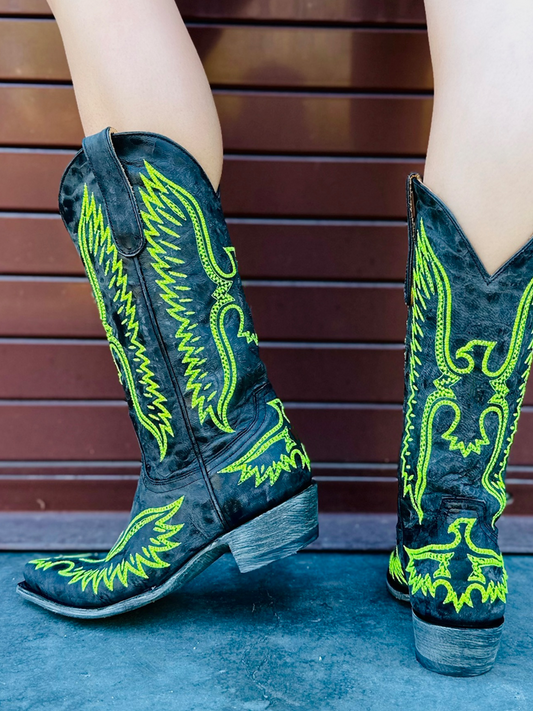 Distressed Black Snip-Toe Yellow Eagle Embroidery Wide Mid Calf Cowgirl Boots