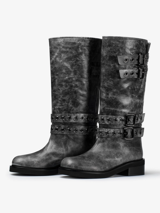 Distressed Black Square-Toe Wide Mid Calf Boots With Buckles And Eyelets