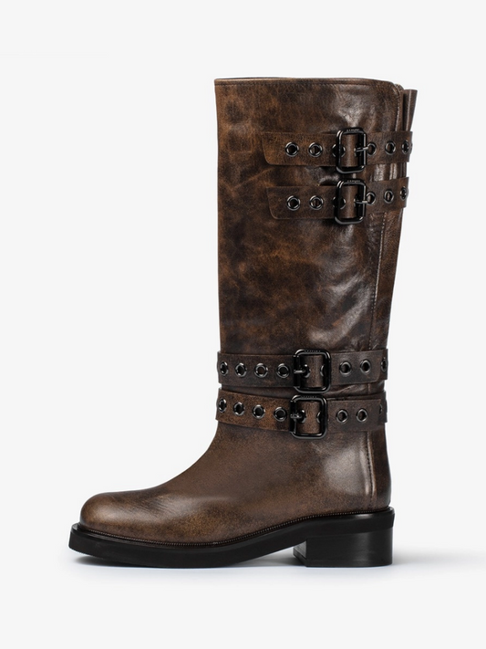 Distressed Brown Square-Toe Wide Mid Calf Boots With Buckles And Eyelets