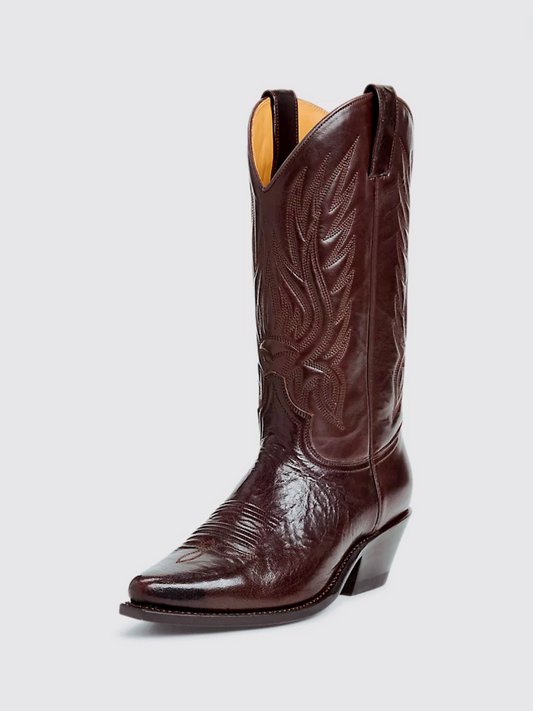 Dark Brown Snip-Toe Classic Embroidery Tall Wide Mid Calf Western Boots