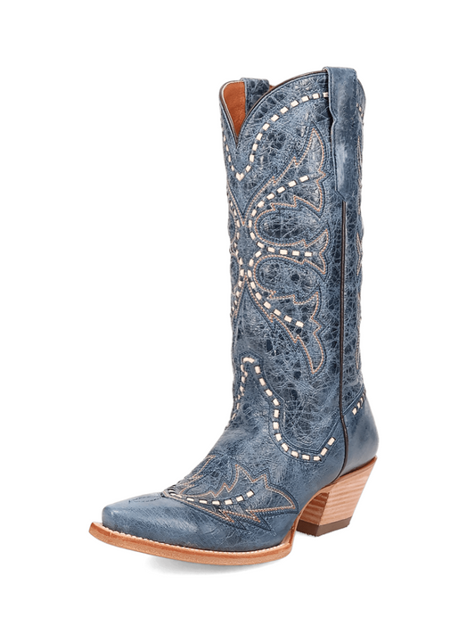 Distressed Blue Snip-Toe Embroidery And Running Stitch Wide Mid Calf Cowgirl Boots