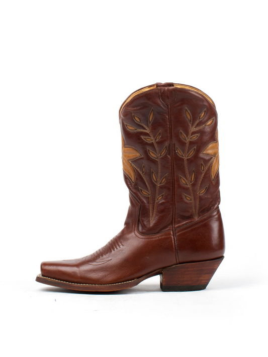 Dark Brown Snip-Toe Flower And Leaves Inlay Wide Mid Calf Cowgirl Boots
