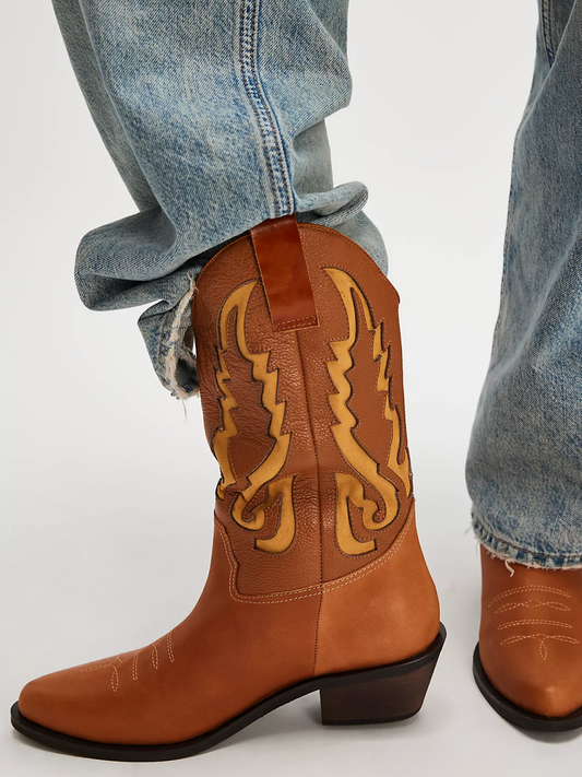 Dark Tan Pointed-Toe Inlay Wide Mid Calf Cowgirl Boots