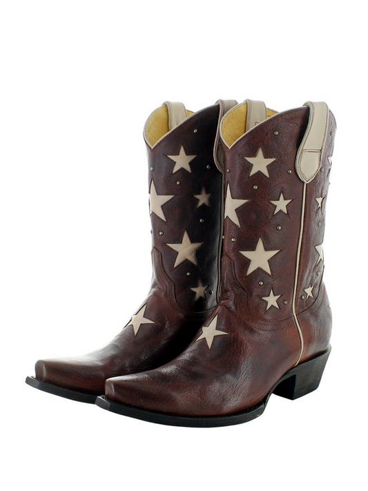 Dark Brown Snip-Toe Studded White Star Inlay Wide Mid Calf Cowgirl Boots