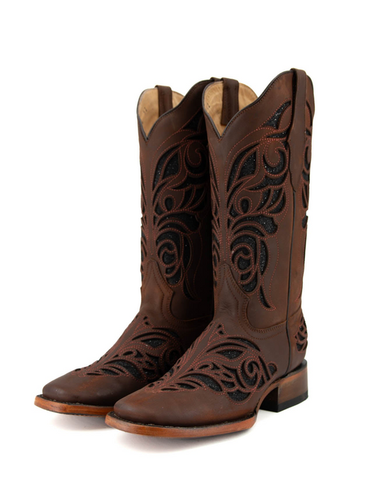 Dark Brown Square-Toe Inlay Giltter Wide Mid Calf Cowgirl Boots