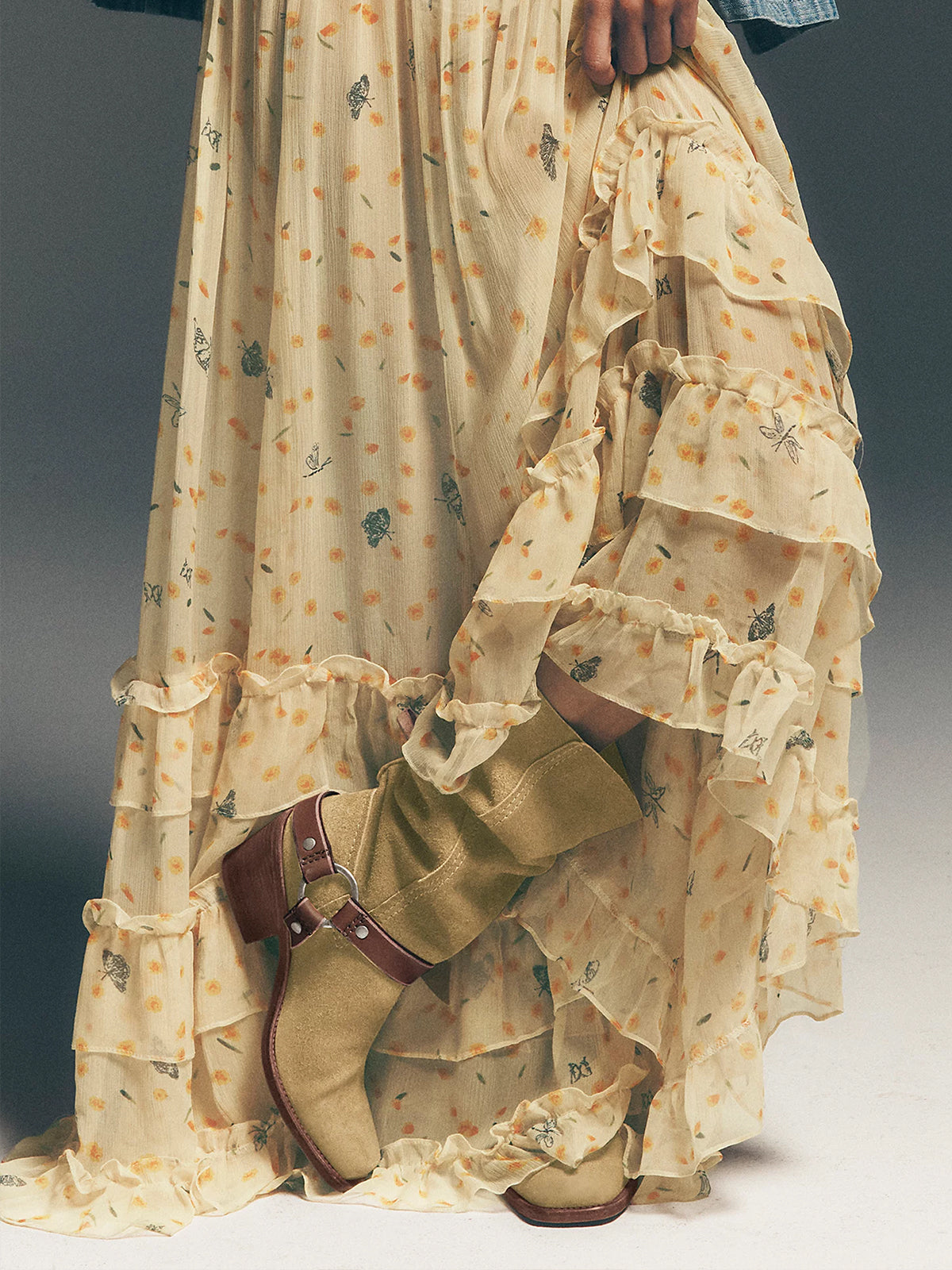 The boots feature a square-toe design, vegan leather material, and spur-inspired buckle details. With a mid-calf length, they are perfect for a cowgirl boot style. Ideal for those who love Western or country-inspired outfits.