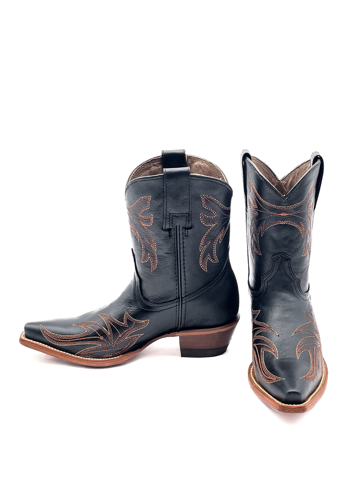 Timeless and versatile, these booties feature a sharp snip-toe silhouette accented by classic Western embroidery. The clean finish keeps the look sleek and easy to style, while the ankle height offers everyday comfort and flexibility—perfect for Western-inspired outfits or modern casual looks.