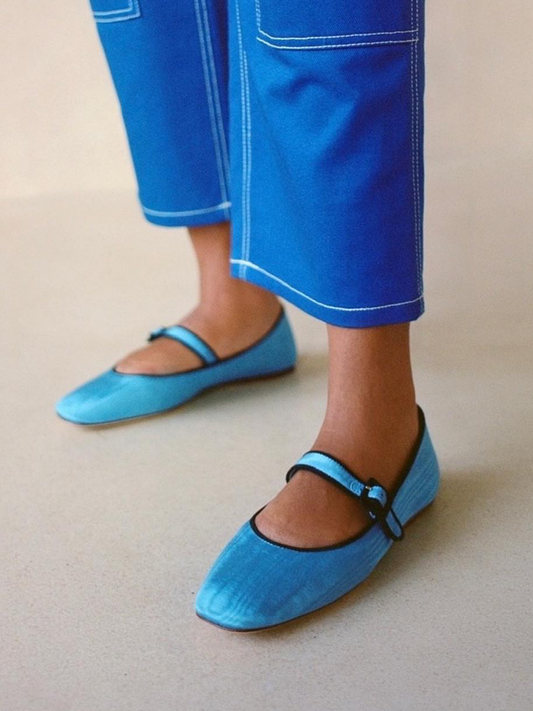 Blue Cloth Square-Toe Adjustable Bridge Strap Mary Janes Ballet Flats