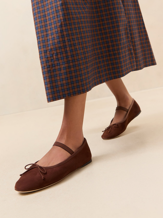 Cafe Faux Suede Almond-Toe Elastic Bridge Strap Bow Ballet Flats