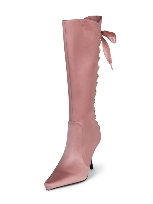 Pink Satin Fabric Pointed-Toe Full-Zip Mid Calf Stiletto Boots With Lace-Up