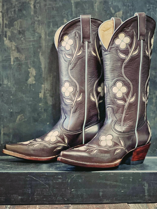 White Flower Inlay Pointed-Toe Wide Mid Calf Tall Cowgirl Boots In Chocolate