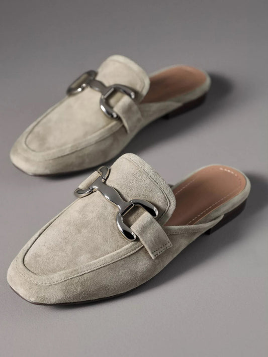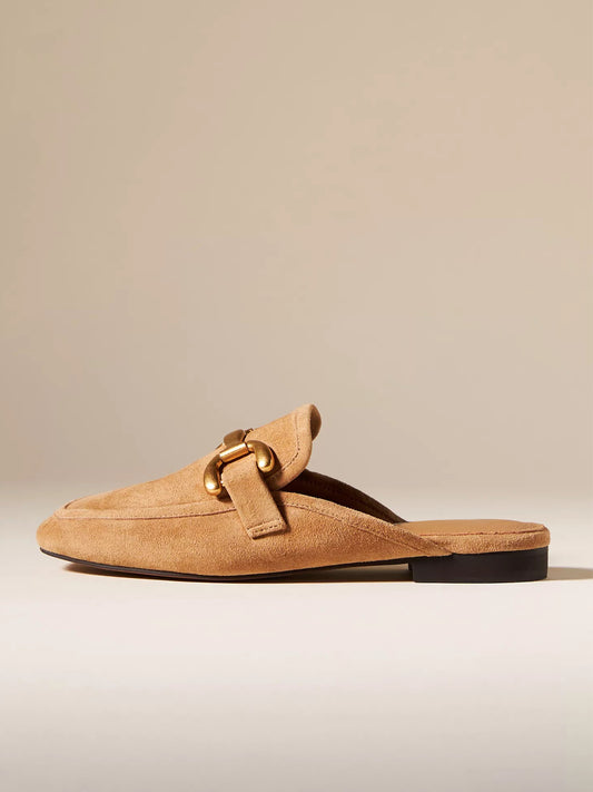 Camel Faux Suede Square-Toe Slip-On Front Metal Detail Flats Loafers