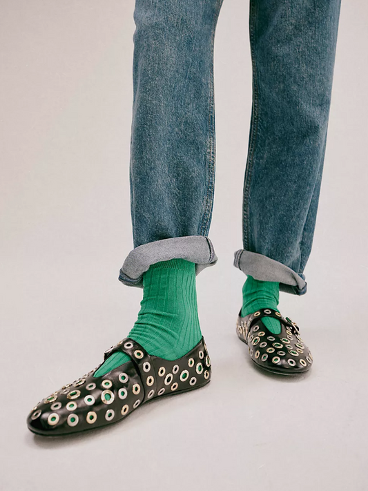 Black Round-Toe Bridge Strap Metallic Eyelets Ballet Mary Janes Flats