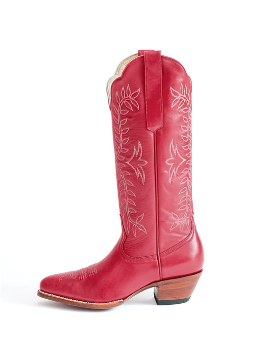 Leaves Embroidery Almond-Toe Wide Knee High Cowgirl Boots - Watermelon Red
