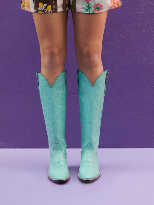 Mint Green Almond-Toe White Flower Inlay Wide Calf Knee High Cowgirl Boots