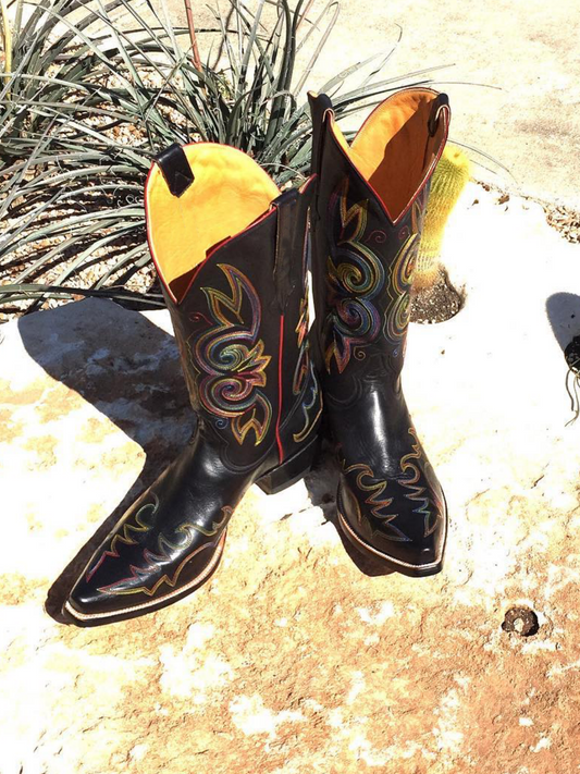 Black Vegan Leather Colorful Embroidery Snip-Toe Wide Mid Calf Tall Western Boots