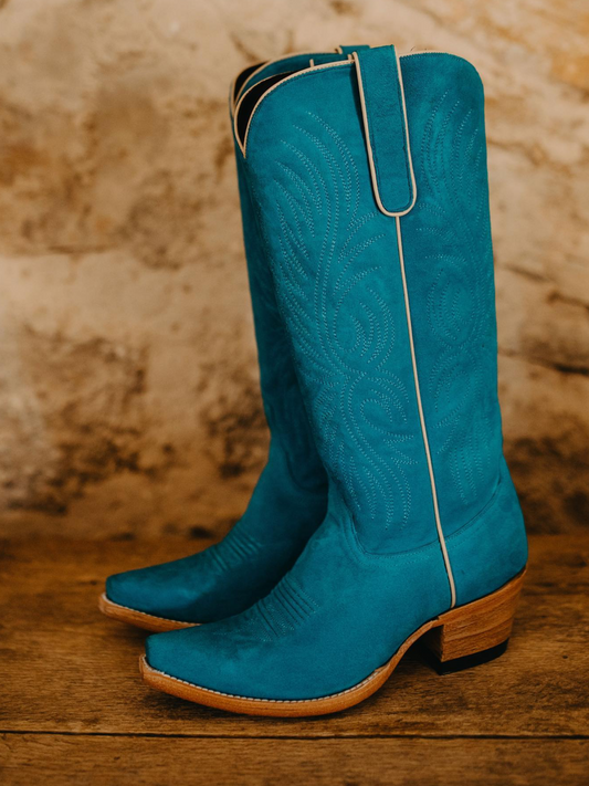 Blue Embroidery Faux Suede Snip-Toe Wide Calf Cowgirl Boots Knee High Tall Boots