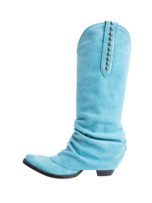 Blue Faux Suede Snip-Toe Studded Tall Wide Mid Calf Fold-Over Slouch Cowgirl Boots